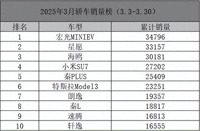 日前,知嘹汽车从中国乘联会获取到了2025年3月份(3.03-3.30)轿车销量排行榜。根据公布的数据来看,3月份轿车市场竞争异常激烈,共有6款车型销量突破2万辆,宏光MINIEV、吉利星愿、比亚迪海鸥,分别为位列前三的位置。同时,国产轿车已经成为了市场的主流,像是速腾、轩逸等合资车型,仅排在销量榜第九、十名的位置。